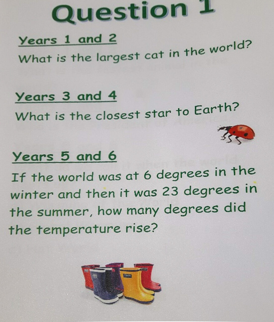 Er mwyn annog disgyblion i fwynhau cerdded ym mhob tywydd, cynhaliodd y Pwyllgor Eco weithgaredd ‘cerdded mewn esgidiau glaw’ yn nhymor y Gwanwyn i gael ei gwblhau fel rhan o waith dosbarth. Cafodd cwestiynau i bob blwyddyn ysgol eu rhoi o gwmpas yr ysgol a chafodd disgyblion ym mhob dosbarth eu hannog i ddod o hyd i’r atebion ar gyfer gwobrau amser chwarae.